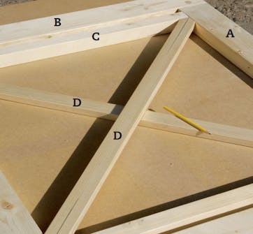 Porttien kehykset (piirroksessa A ja B ) rakennetaan 45 x 95 mm:n höylätystä männystä. Listojen (C) mitat ovat 40 x 45 mm. Listat voit tehdä halkaise-malla höylätavaran pituussuunnassa. Sitten vain höyläät ja hiot sen listojen tarkkaan mittaan.