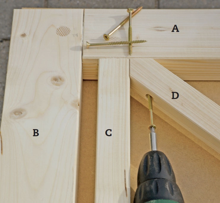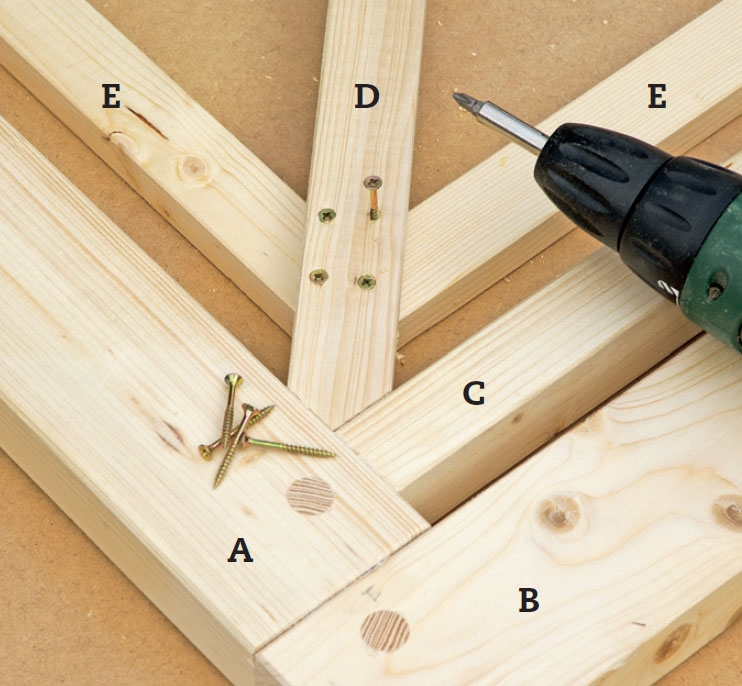 Kokoa nelikulmiot (E ja F) ja aseta ne ristikkäisten listojen päälle. Käytä kokoamiseen liimaa ja viittä 70 mm:n ruuvia. Kiinnitä ne liitoskohdista levyn suorakulmaiseen nurkkaan ruuvipuristimilla. Näin kehyksestä tulee suorakulmainen.