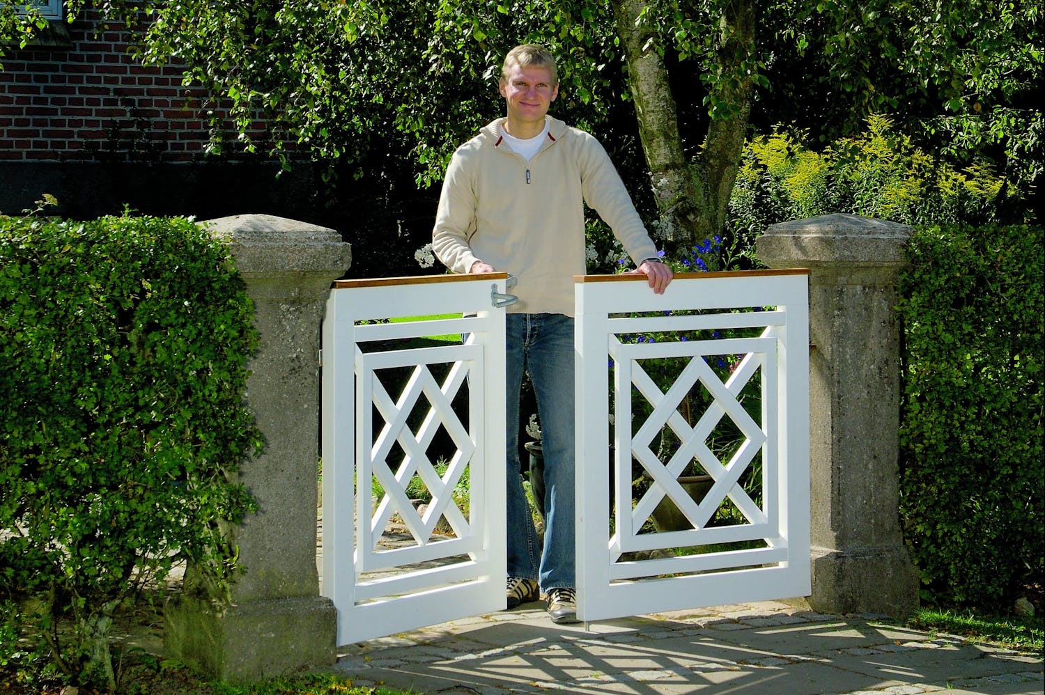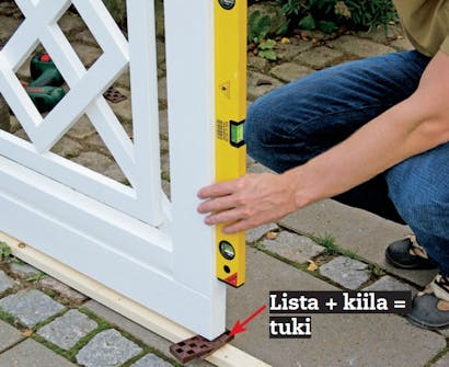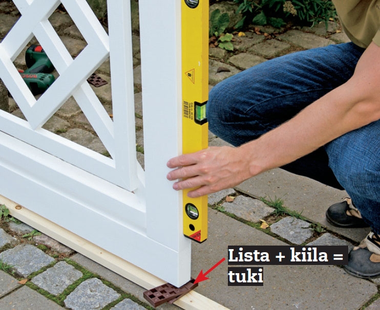 Aseta saranat tappeihin ja sijoita portti niin, että se on 3 cm irti maasta. Aseta 25 mm paksu lista portin alustaksi. Tue porttia kiiloilla tai ohuilla levynpaloilla, kunnes portin yläreuna on vaakasuorassa ja sivut pystysuorassa.