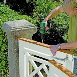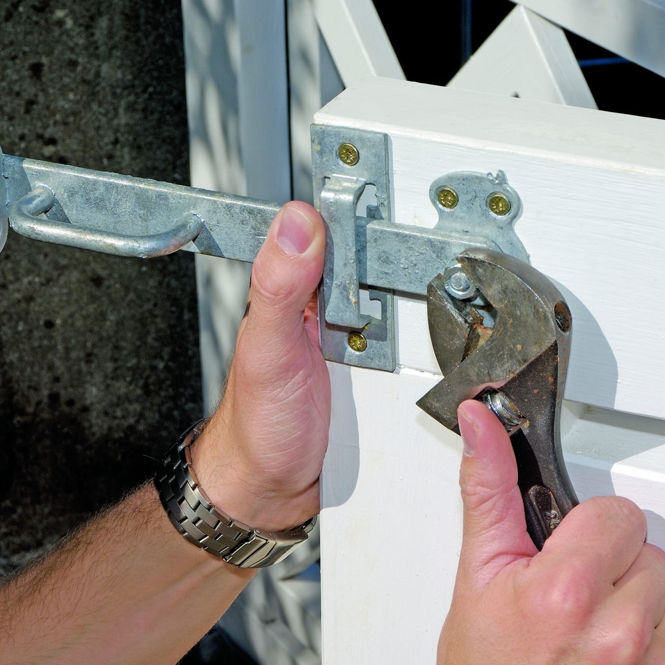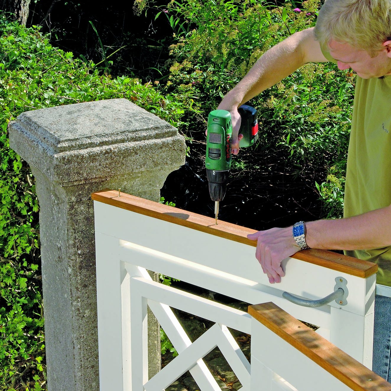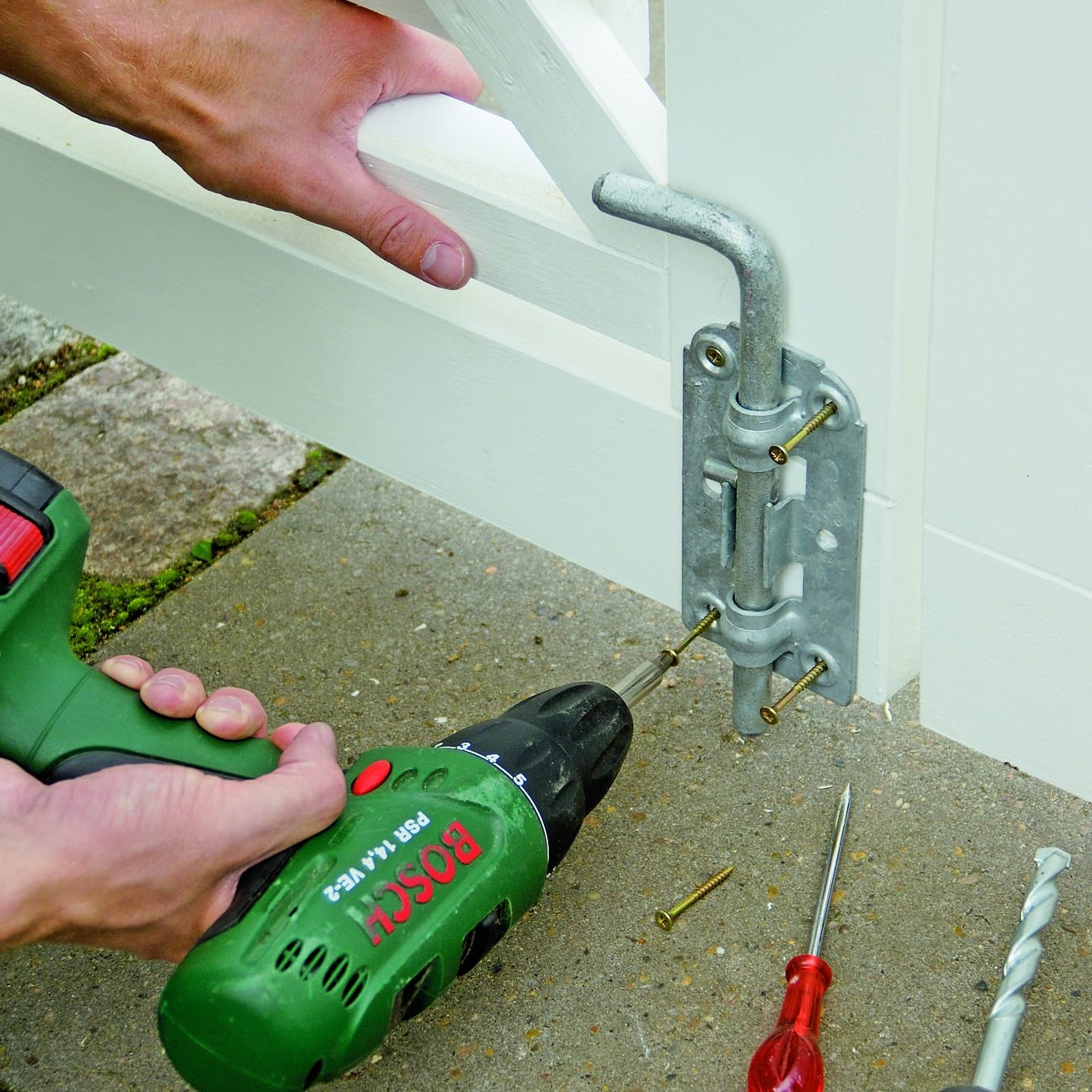 Kun portti istuu hyvin paikallaan, kiristä saranan ympärillä oleva puristin. Kiinnitä sarana porttiin neljällä 40 mm:n ruuvilla.