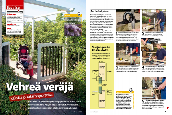 Kun porttien kehykset ja pienat on maalattu ja koottu, voidaan kiinnittää saranat ja helat. Portti ripustetaan koukkusaranan varaan seinää ja tolp-paa vasten. Portin avaamiseen ja sulke-miseen tarvitaan nivelsalpa. Tuplaport-tien väliin asennetaan työntösalpa.