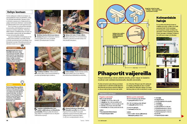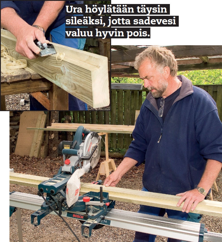 Porttien kaksi vaakapalkkia ovat eni-ten alttiita kosteudelle. Jotta sadevesi valuisi nopeasti pois puuosien pinnalta, molempien vaakapalkkien reunat saha-taan viistoon. Pienojen päädyt suojataan kiinnittämällä pienat kehyksen uriin ja sahaamalla päät viistoon.