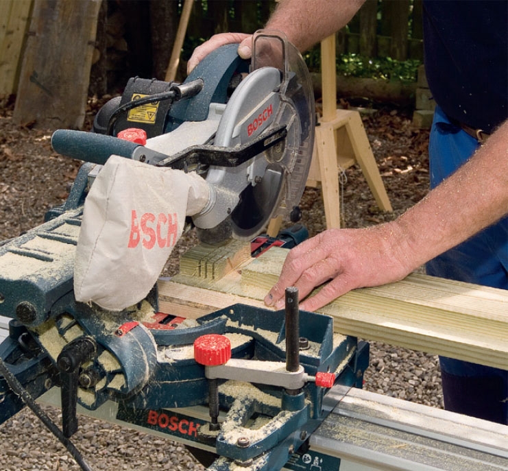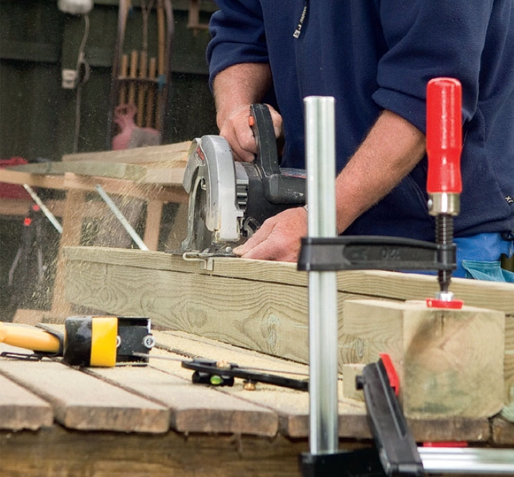 Käännä palkkia 90°. Kiinnitä palkki kahdella puristimella ja sahaa suoraan kulmaan. Pyörösahan pohjalevystä ei nyt ole juurikaan tukea, joten sahaa hitaasti.