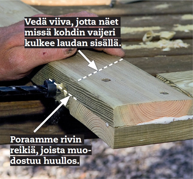 Tarkista vielä kertaalleen, miten vaijerin pitää sijoittua ennen kuin po-raat 6 mm poralla pitkän reiän loviliitok-seen. Reiän pitää olla noin 10 cm pitkä. Jos et omista näin pitkää poraa, joudut poraa-maan sekä laudan ylä- että alareunasta.