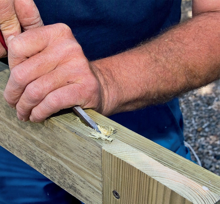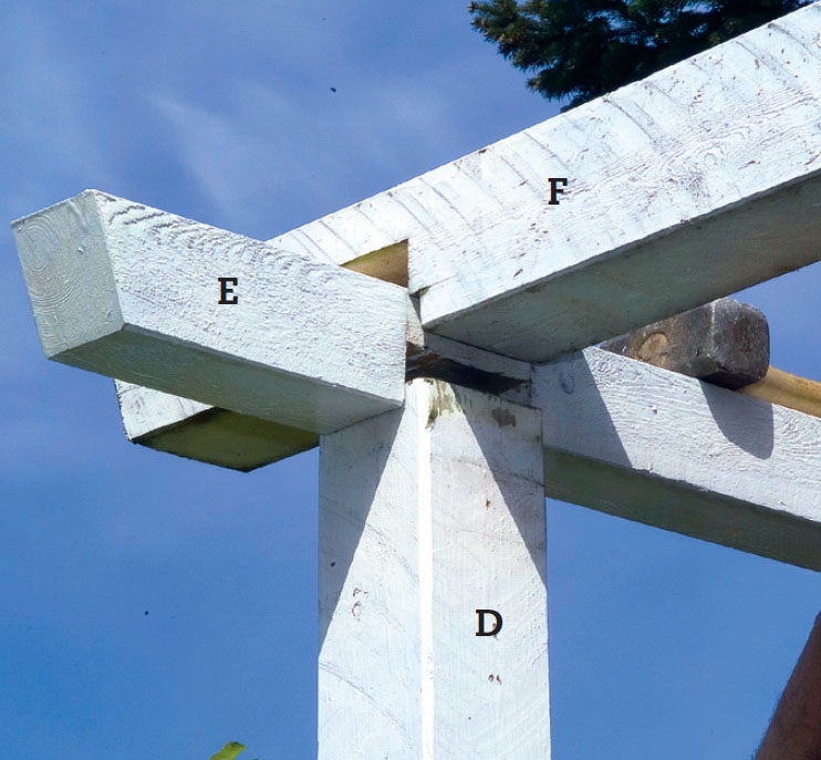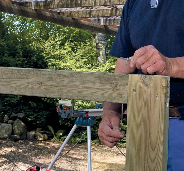 Käytimme pergolan yläpalkkeihin kahta eri puutavarakokoa (75 x 75 ja 100 x 100 mm), jotta pystyimme yhdistä-mään palkit lovilla käyttämättä lainkaan nauloja tai ruuveja. Tämän voi kuitenkin tehdä vain, jos palkit ovat täysin suorat. Voit myös esiporata ja asentaa kansi-ruuvit jokaiseen liitokseen päältä päin.