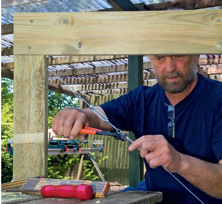 Kun vaijeri on asennettu kum-paankin sivuun, se yhdistetään vaijerikiristimiin. Vaijeri kiristetään kevyesti. Nyt kehys on vakaa, ja se voidaan pohjustaa ja maalata kahdella puunsuojakerroksella.