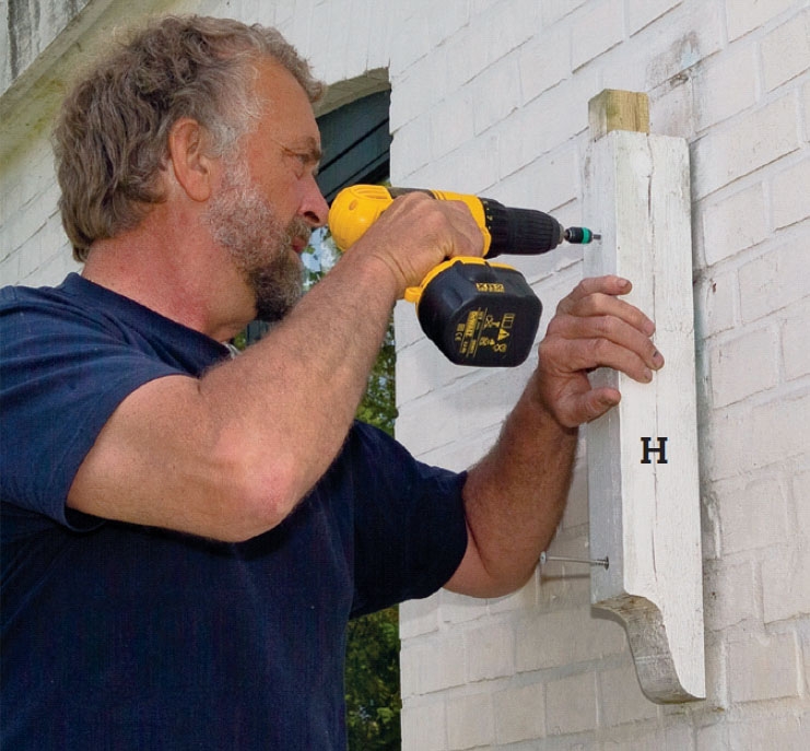 Kiinteän seinän ylin kiinnike (H) sahataan piirustuksen mittojen mukaan. Tappi sahataan ja taltataan siistiksi ja sille taltataan lovi yläpalkkiin (F).
