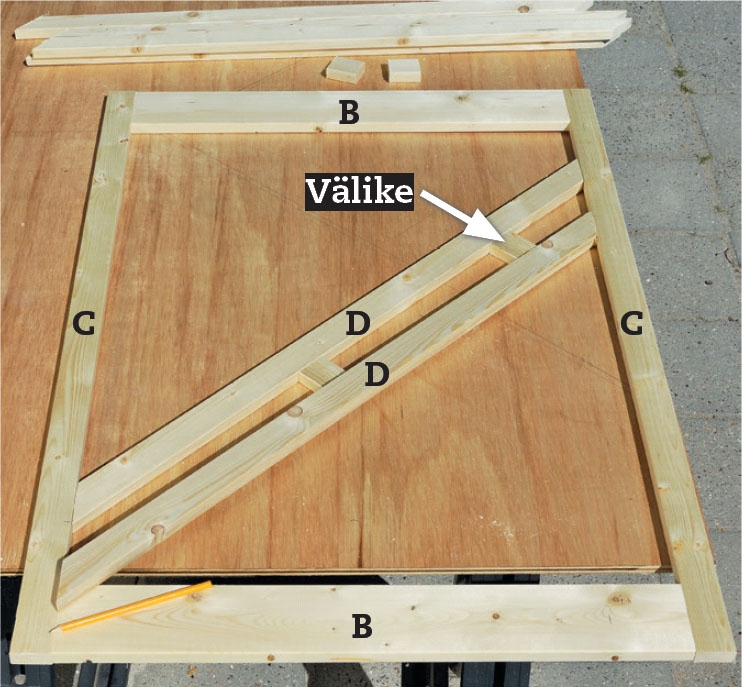 Täytä kehys listoilla. Aloita pitkistä listoista (D). Kulmiin osuvien listojen päihin sahataan 90°:n kulma, jotta ne sopi-vat kehyksen kulmiin. Käytä välikkeitä listoja asentaessasi, jotta saat niiden väleistä täsmälleen yhtä suuret.