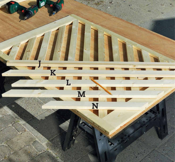 Käännä portti ja asenna toinen listakerros (J, K, L, M ja N) toiselle puolelle. Katso, miten listat on sahattu kehyksen ulkoreunojen linjaan ja sahaa listat tähän tapaan.