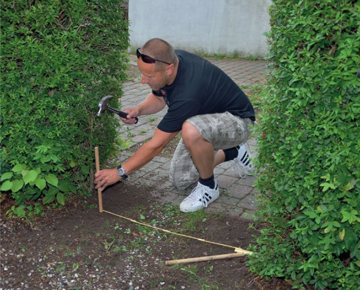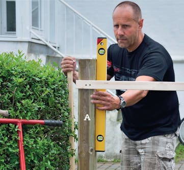 Mittaa, mihin kohtaan tolpat (A) tulevat ja lyö näihin kohtiin kepit. Lisää 10 mm portin etäisyyteen kummastakin tolpasta. Voit tarvittaessa sahata sopivan pituisen listan tolppien välille, jotta voit käyttää sitä mitta-apuna.