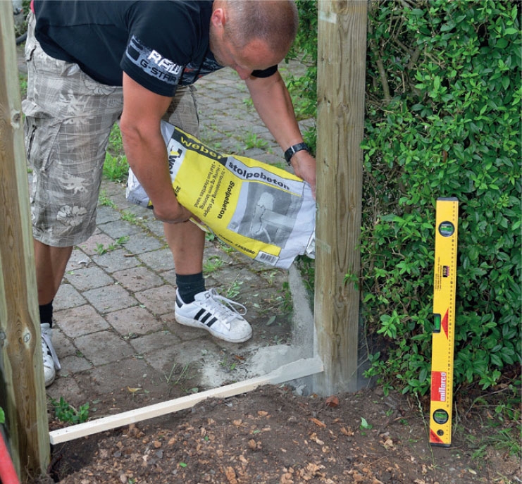 Kastele kuoppien kuivabetoni. Täytä päälle maata ja tamppaa se kunnolla. Lisää betonia niin, että tolppien ympärille muodostuu kaksi ankkuria. Täytä kuopat lopuksi maalla. Anna tolppien nyt seistä vuorokausi, jotta betoni kuivuu.