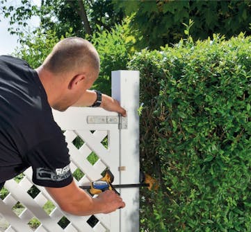 Nyt portti on valmis asennettavaksi. Kun kiinnität sen tolppiin, varmista, että portin ja tolppien väliin jää hieman väliä, jotta portti pystyy aukeamaan ja sulkeutumaan kunnolla, ja jotta portin kiinnittäville saranoille jää tilaa. Portin sijainti on helpoin määritellä ja tarvittaessa oikaista sitä, jos kiinnität sen ensin väliaikaisesti paikoilleen ruuvipuristimilla.