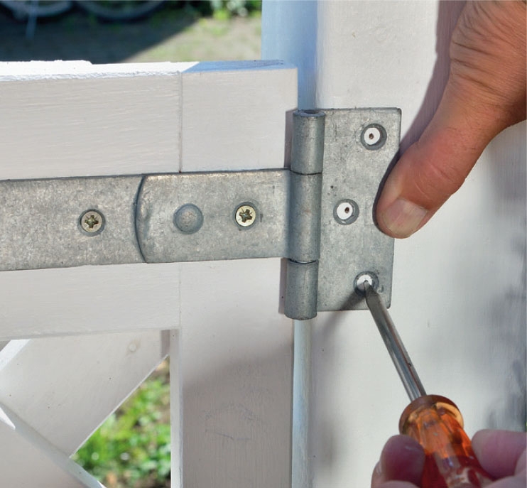 Pidä saranoita tolppaa ja porttia vasten ja merkitse ruuvien paikat. Kiinnitä saranat 4 x 40 mm ruuveilla.