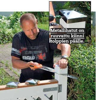 Portin yläosassa listojen päätypinnat katetaan päällyslaudalla. Esimerkissä valittiin tummaa puuta oleva päällys-lauta, jotta valkoiselle portille saatiin hieman kontrastia. Tolppien päälle asennetaan hatut, jotka suojaavat tolpan pintaa niin, että tolpat kestävät pidempään.