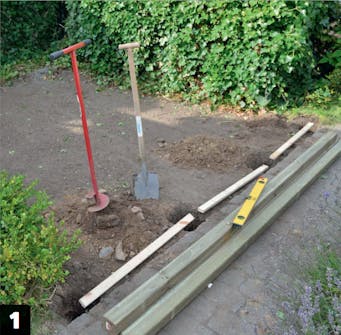 Tasoita aidan sisäpuolelle jäävä alue sillä aikaa, kun betoni kuivuu. Poista aluksi kaikki kasvit ja haravoi pinta kutakuinkin tasaiseksi.
