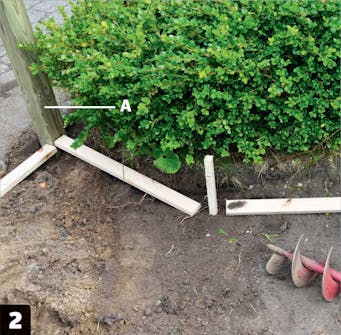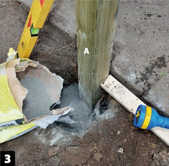 Säädä tolpat (A) suoraan ja painele betoni samalla tiiviiksi esimerkiksi 45x45 millin rimalla. Kun tolpat ovat suorassa, kostuta betoni. Älä kastele sitä läpimäräksi.