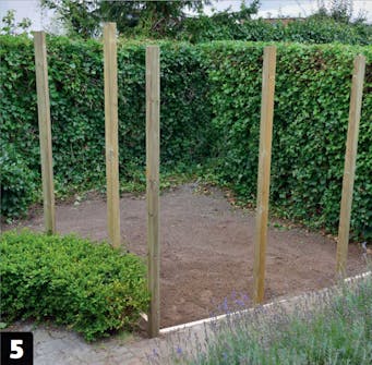Kaiva kuopat tolpille. Ne on helpointa tehdä maakairalla. Tolpat asennetaan 94 sentin välein, sillä aitaelementit ovat sen levyisiä.