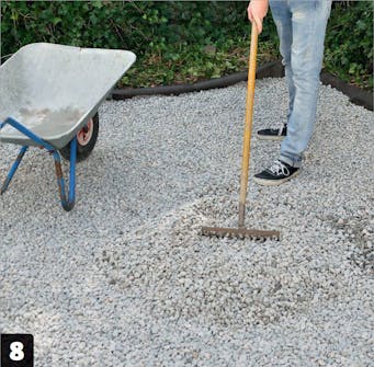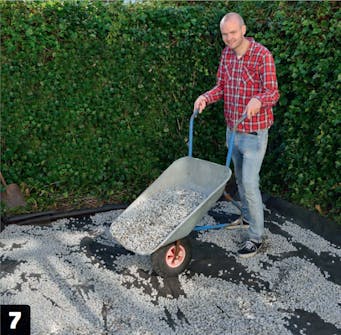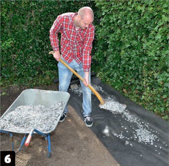 Levitä maahan kuitukangas, jotta rikkaruohot eivät kasva alhaalta päin. Levitä pari lapiollista mursketta kankaan päälle, jotta se pysyy paikallaan. Se estää myös mursketta vajoamasta maahan.