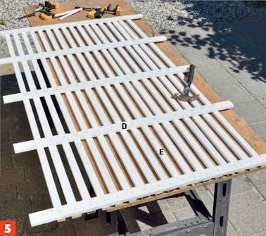 Naulaa alin poikkirima (D) kiinni rimoihin (E). Asenna ensimmäinen pystyrima poikkiriman keskelle ja naulaa se kiinni 1,8x40 millin naulalla. Asettele loput rimat noin 2,4 sentin välein ja naulaa ne kiinni.