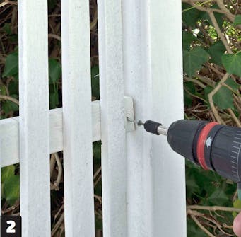 Maalaa rimat (E) ja poikkirimat (D). Käytä peittävää ulkomaalia ja valitse sävy makusi mukaan. Tässä käytetään valkoista, jotta aita ei herätä liikaa huomiota.