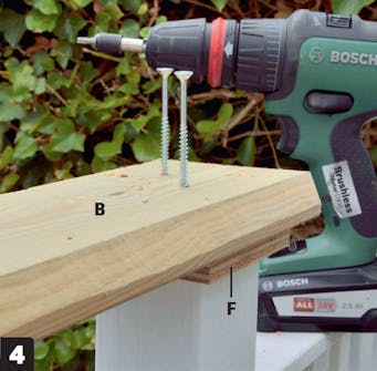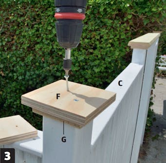 Suojaa tolppien päät. Ruuvaa aluksi kiinni pienet levynpalat (G) 5x60 millin ruuveilla. Ruuvaa sen jälkeen kiinni isommat levyt (F). Asenna samalla peitelaudat (C) ylempien poikkirimojen päälle.