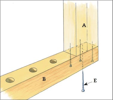 Kiinnitä sivut (A) pohjapalkkiin (B) 5 x 90 mm:n ruuveilla (E). Esiporaa kaikki ruuvireiät ennen raamin kokoamista.
