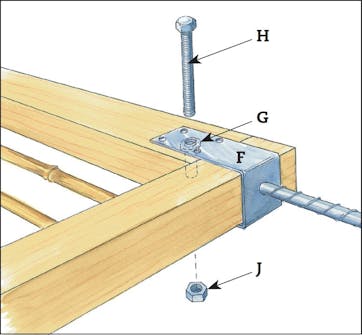 Asenna aluslaatat (G) pilarikengän ja sivutolpan (F) väliin. Upota pultit (H) läpi ja kiristä mutterit (J).