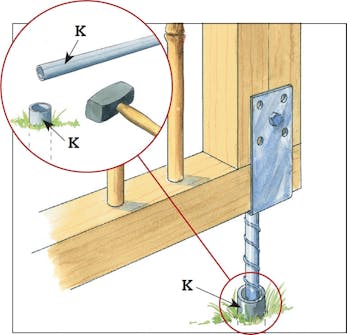 Asenna pilarikengät (F) irralleen raamin pohjapalkkiin, merkitse suuri keskireikä ja esiporaa pulttien reiät 12 mm:n poranterällä.