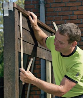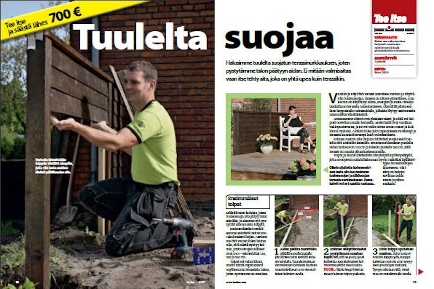 Verhoilulaudat kiinnitetään molemmilla sivuilla pystyri-moihin. Aloitamme ylhäältä, jonne laudat on saatava istu-maan tarkasti - alas voi tar-vittaessa jäädä rakoa. Asetamme aidan päälle hie-non kaarevan päällilaudan, jossa on tippanokka. Se ohjaa sadeveden pois - ja sen päällä pysyy myös kahvikuppi.