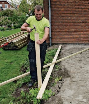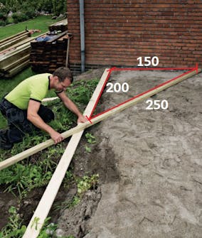 Aidan paikka merkitään pitkällä suoralla laudalla, joka lähtee talon seinältä terassin kohdalta. Suorakulmaisuus varmistetaan kahdesta laudasta muodostettavan 3:4:5-sivusuhteisen kolmion avulla.