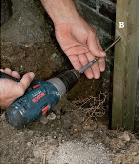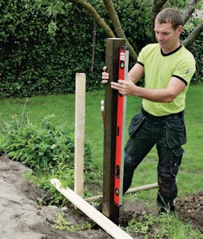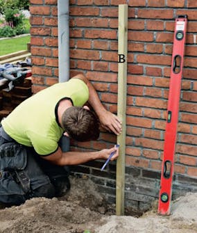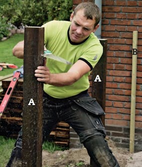 Tolpat (A) sahataan oi-keaan korkeuteen, kun ne ovat maassa tukevasti kiinni. Sijoita aina sahaamaton - ja täten kyllästetty - tolpanpääty alaspäin. Korkeus sovitetaan seinäriman (B) mukaan.