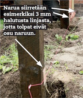 Kiristämme seinän ja tolpan väliin narun, jotta saamme keskitolpan tarkasti paikalleen. Muista, että seinässä oleva rima on kapeampi kuin tolpat, joten riman ja tolpan etureunan väliin jää 30 mm.