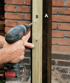Sijoita talon päätyyn kiinnitettävä rima (B) niin, että se on samassa linjassa uloimman tolpan A sivuun kiinnitetyn riman kanssa - ei siis itse tolpan reunan kanssa.