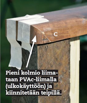 Päällilauta (C) viimeistellään sahaamalla se 45°:n kulmaan 20 mm uloimman tolpan ulkolinjan ulkopuolelta. Sahaamme vastaavan kolmion sahaamastamme palasta ja liimaamme sen päätyyn kiinni.