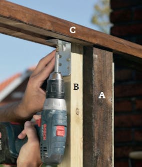 Verhoilulaudat (D) kiinnitetään rimoihin (B) 4 x 50 mm ruuveilla. Niiden pitää olla haponkestäviä, jotta ne kestävät kestopuussa. Aloitamme yläreunasta.