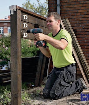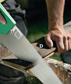 Laudat (D) sahataan pituuteen niin, että ne istuvat tiukasti tolppien väliin. Voit käyttää käsisahaa, mutta työ sujuu nopeammin ja siistimmin, jos saat käyttöösi katkaisusahan.