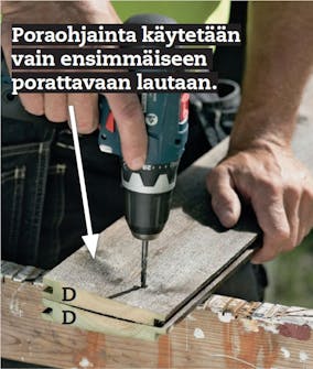 Esiporaamme lautojen (D) ruuveja varten, jotta ruuvit saataisiin lautojen päätyihin tiukasti ja suoraan linjaan eivätkä laudat halkeaisi. Käytämme poraohjainta ensimmäiseen lautaan.