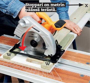 Laudat sahataan mittaan nopeasti ja varmasti suorakulmaisella viillolla, kun laudat on asetettu sahausalustalle takalistaa vasten. Jotta jokaista listaa ei tarvitsisi mitata ja merkitä, kiinnitämme stopparin (X) metrin päähän terästä. Sahaa myös poikkilaudat.