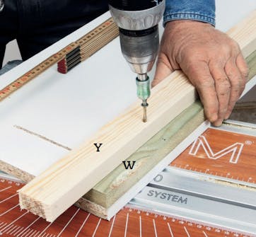 Saha kiinnitetään levyyn, jotta sitä voi nostaa ylös ja alas kuten katkaisusahaa. Kiinnitä kaksi 21 mm listaa (W) levyyn, poraa reiät sahan pohjalevyyn ja ruuvaa saha rei’istä listoihin kiinni, jolloin terä on suorassa kulmassa takimmaiseen listaan nähden.