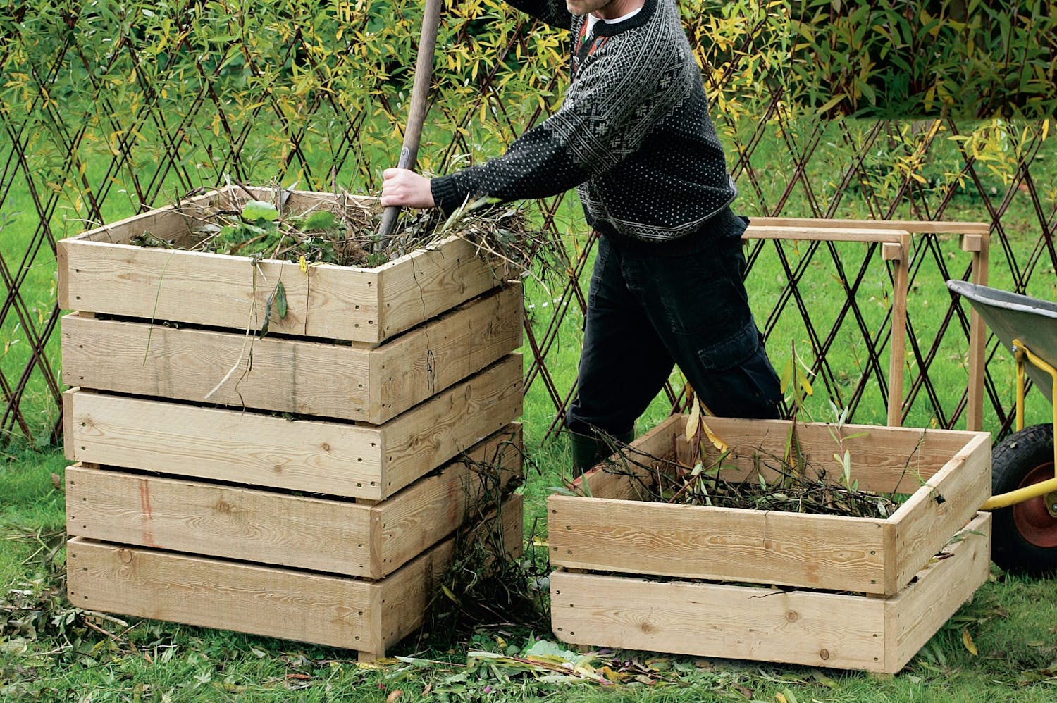 Kompostisäiliö koostuu 77,5 x 77,5 cm:n kehikoista. Ole tarkkana mittojen kanssa, jotta kehikoista tulee yhtä suuria ja ne saa helposti aseteltua päällekkäin. Kehikoiden täytyy pysyä suorassa.