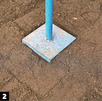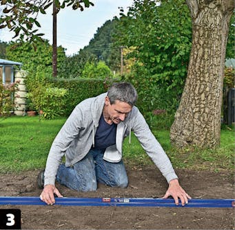 Tarkista, että pohja on tasainen. Jos pinta viettää, lisää maata ja tiivistä se uudestaan käsijuntalla.