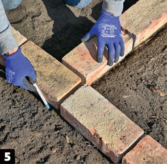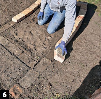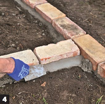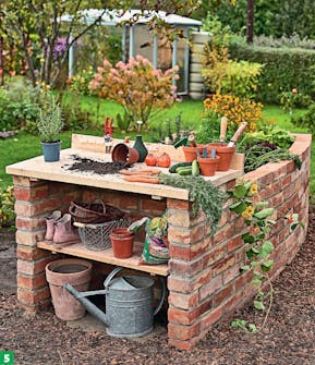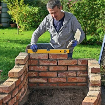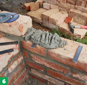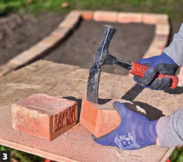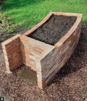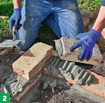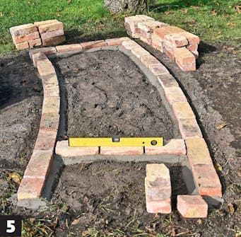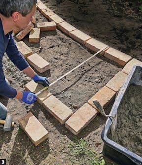 Tee kohonpenkistä koeladonta, jotta saat käsityksen siitä, minkä kokoinen ja muotoinen muurista kannattaa tehdä. Tästä kohopenkistä tulee kaareva, ja sen toiseen päähän tehdään pöytä ja hyllyjä. Jätä tiilten väliin noin sentin levyiset saumat.