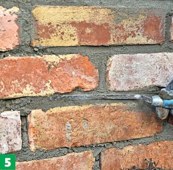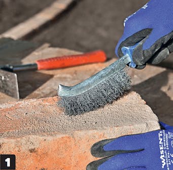 Poista vanha laasti, jos sitä on vanhoissa tiilissä. Voit koputtaa enimmät irti muurausvasaralla ja poistaa loput teräsharjalla.
