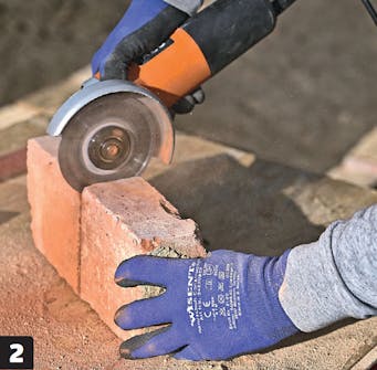 Leikkaa valmiiksi puolikkaita tiiliä, jotta voit muurata tiilet puolen kiven limityksellä. Voit leikata tiiliin urat kolmelle sivulle kulmahiomakoneella. Sen jälkeen voit katkaista tiilet vasaran kopautuksella.