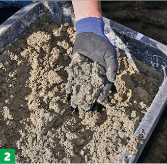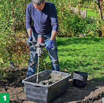 Voit sekoittaa betonin ja laastin joko käsin muurauskauhalla tai käyttää laastinsekoittajaa ja vispilää. Jos käytät konetta, valitse vähintään 1 000 watin malli, jotta moottori ei kärähdä. Sekoita säkillinen kerrallaan, sillä laastia on vaikea käyttää, jos se jähmettyy liikaa.