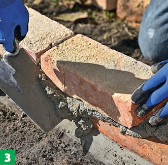 Aivan aluksi kouru pitää kuitenkin täyttää betonilla, jotta muuri saa hyvät perustukset. Kun ensimmäinen rivi on paikallaan, voit tehdä betonista reunatuet tiilten ympärille.