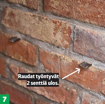 Saumoihin upotetaan pari rautakiinnikettä siihen päätyyn, johon tehdään hyllyt. Rautojen pitää pistää ulos muurista, jotta hyllyt voi kiinnittää niihin.