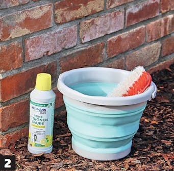 Tarkoitukseen on erikoistuotteita, mutta voit puhdistaa muurin myös etikkavedellä, johon on lisätty hieman sitruunahappoa.