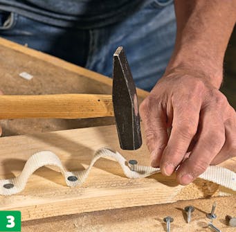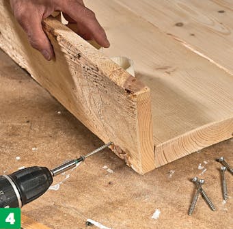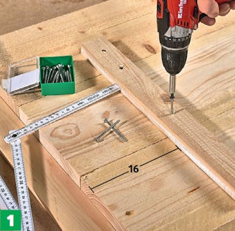 Ruuvaa nauhallinen lauta ylähyllyn taakse. Kohdista ruuvit niin, että ne osuvat keskelle hyllyn reunaa.