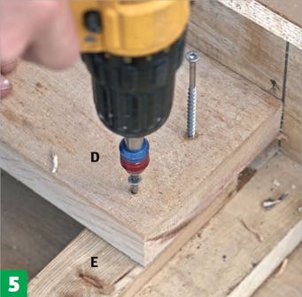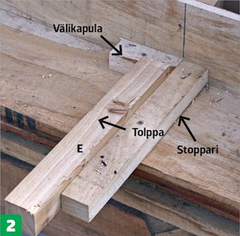 Tee kätevä ”työpöytä”. Kiinnitä kaksi leveää lautaa toisiinsa suorassa kulmassa. Asenna laudan päälle rima ja 4 senttiä paksu välikapula, jotta (E) tolpan päähän jää tilaa sidekapuloille (G).